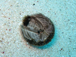 ヒノマルテンスにつつきまくられて あっという間に殻だけになった コオニブンブク。 災難に遭わせちゃってごめんよ〜。 この写真は、底揺れしている中で、 右に左に動く軽い殻の裏側を なんとか撮ったもの。 殻は軽くて簡単に揺さぶられるので、 撮影に苦労した。 |