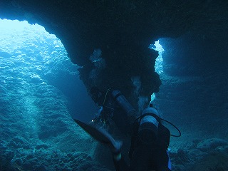 トンネルの真ん中に柱があるよ。 ダイバーと重なっちゃった…。 ダイバーを入れずに撮りたかったのだが、 ダイバーの数が多かったので、 避けて撮影するまでには時間が かかりそうだったから、素直に諦めた。 |