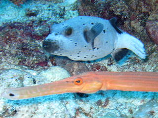 | すっとぼけた顔のコクテンフグと、 超うまづらのヘラヤガラ(赤) のツーショット。 |