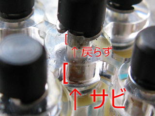 ハウジングの裏側から見た 「センターボタン」。 ボタンの部品の軸に錆が浮き、 動きが鈍くなりボタンが戻っていない。 本来なら上の「戻らず」と書いた「 [ 」の部分が 沈んで(縮んで)いないといけない。 |