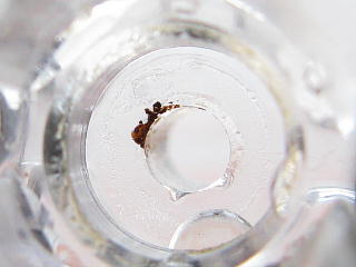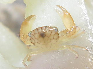 | 他にもGETしてきたサンゴのかけらに よく見たらちっこいカニがくっついていた。 しかしなんと、このカニは死んでいた。 この後、このサンゴを漂白剤に漬けたら、 案の定、カニはバラバラになってしまった…。 |