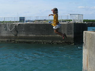 | 3本目の出航をする頃、 4連休の最終日を楽しむわらばーどもが 海遊びをしていた。 こんな小学校低学年の女の子も 数mの高さの岸壁から平気で飛び込む! う〜ん、鍛えられ方がヤマトンチュとは違う。 |