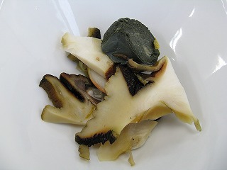 チョウチンマチと夜光貝の刺身も付いた。 | さらに、夜光貝の口の部分と肝も 出してくれた。 みんな、ま〜さんま〜さん! |