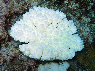 白化したサンゴ。 カリフラワーみたいだ。 先端だけがビミョーに青みがかっている。 |
