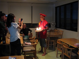 食堂で、還暦を迎えたダイバーの サプライズのお祝いがあった。 ケーキには60本も蝋燭が立てられないから、 1本を10才に見立て、6本立てていた。 おめでとうございます。 |