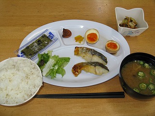 今日のお献立。 | 朝メシ。 お味噌汁に入ってる目玉みたいなのは、 輪切りにした沖縄のくるま麩だよ(笑)。 |