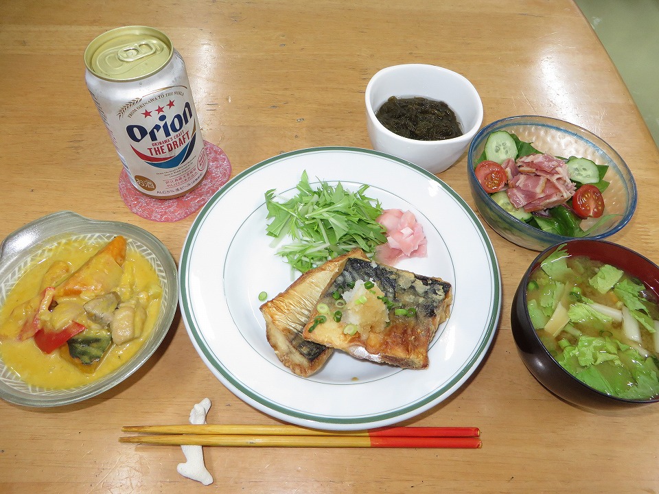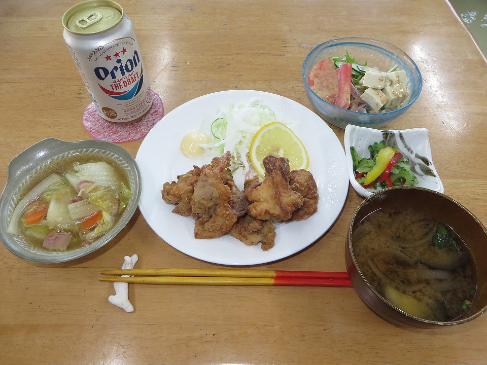 | 晩メシ。 鶏空がたくさん。 コメは1杯にとどめておいた。 オリオンの次は「どなん」に移った。 箸置きは何年か前にナーマ浜で拾ったもの。 何となくハンマーに見えなくもない? うめーしは普段から持ち歩いているもの。 |