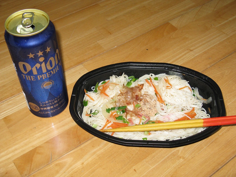 | 那覇に着いて、ゆいレールに乗り、常宿の「月桃」に投宿した。 日付が変わるまでオーナー夫婦と楽しくゆんたくしたよ。 写真は、ゆんたくが終わり部屋で〆に喰ったファミマのソーミンチャンプルー。 |