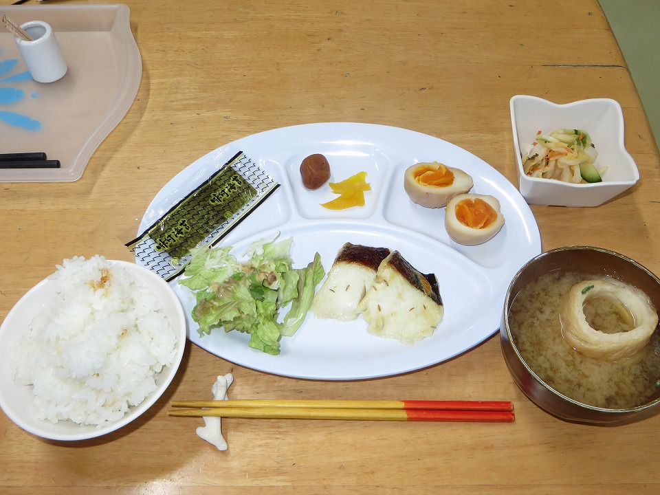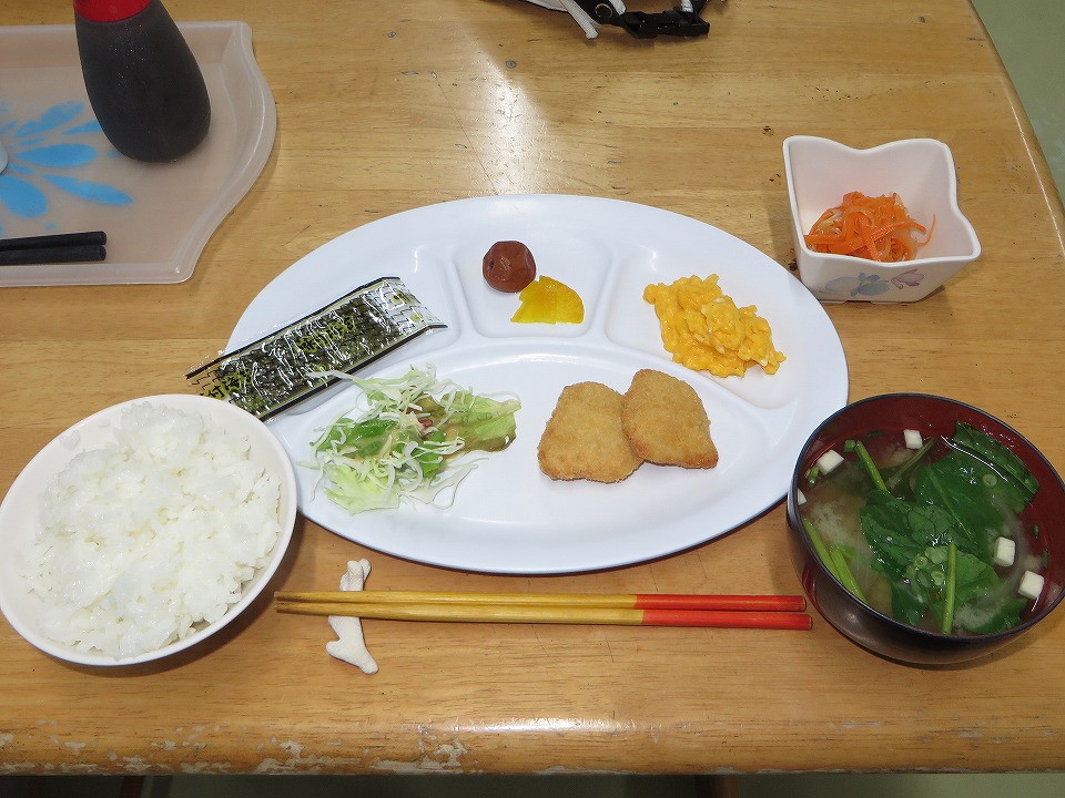 | 朝メシ。 さっきおめざを飲み食いしたばっかなのに、コメはお代わりしてしもた。 |