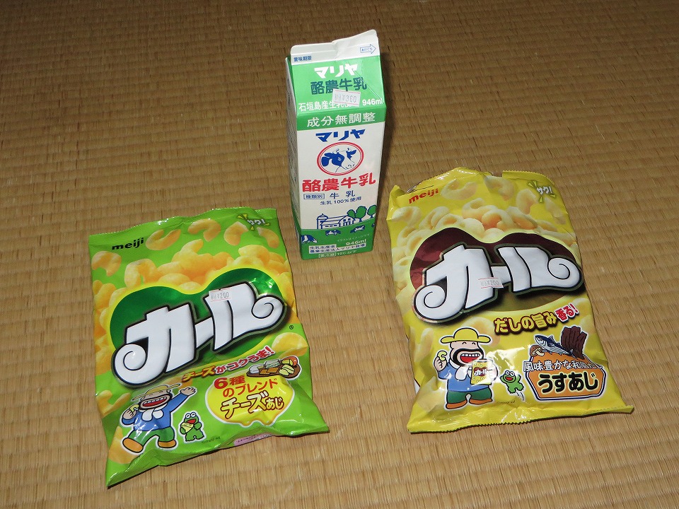 | 05:59:58に目が覚めた。 既にハラが減っているので、昨日奇跡的にGETできたマリヤ牛乳360円ナリと カール2種各200円ナリで、おめざ。 牛乳はフェリー入港日に地元の方の予約がなければ手に入ることがあるよ。 |