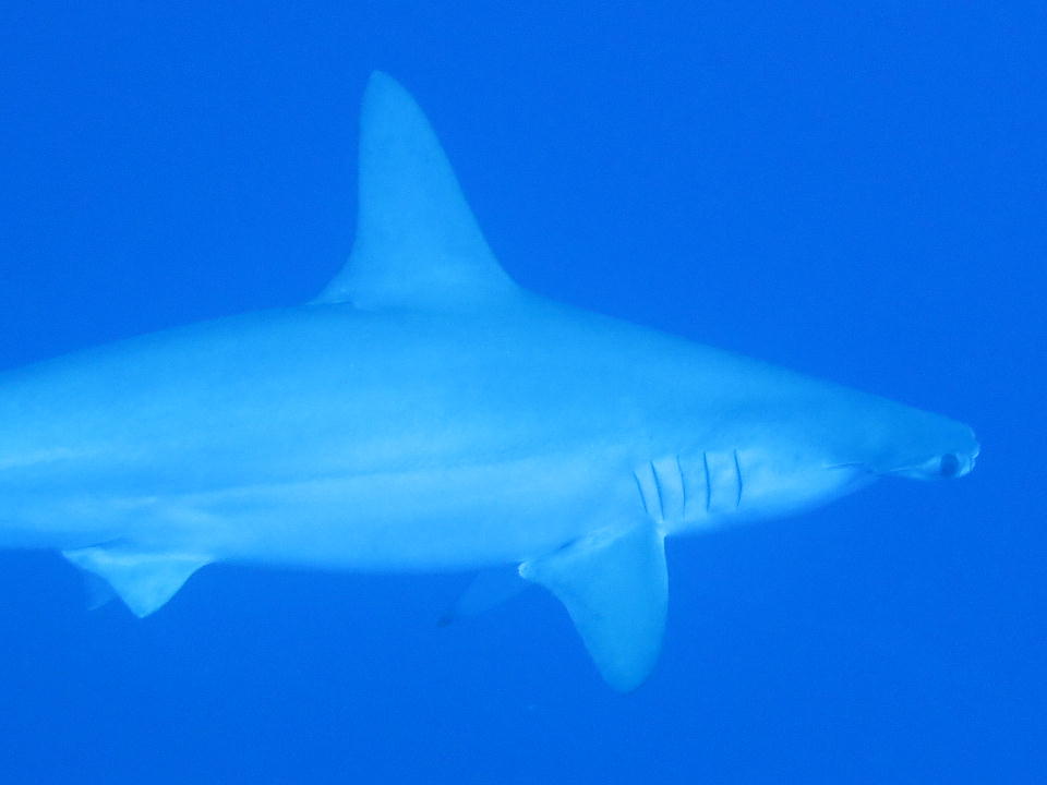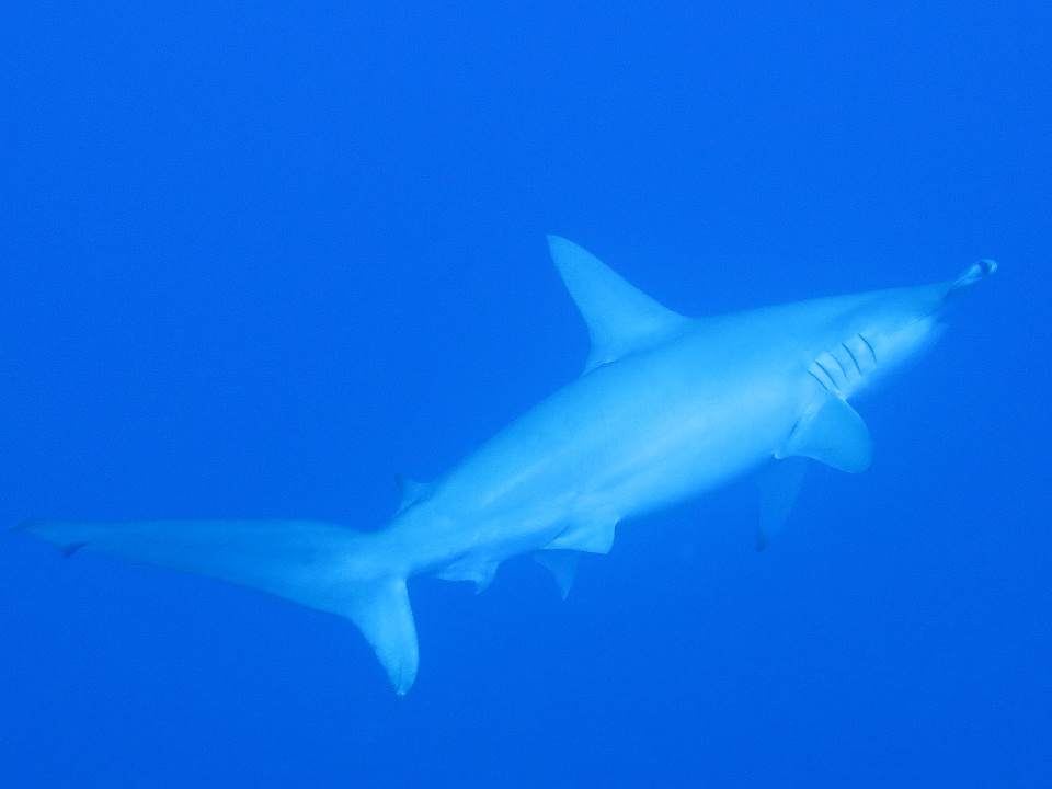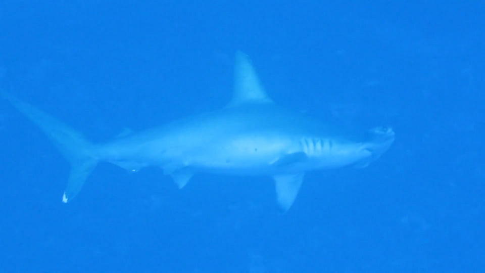 | ハンマーはいたにはいたが、表層に1匹と、深場に1匹…。 表層のヤツの約6秒の動画はこちら。 また6秒と短いが、原版には映っているダイバーやエアをカットするとこうなっちゃった。 |
