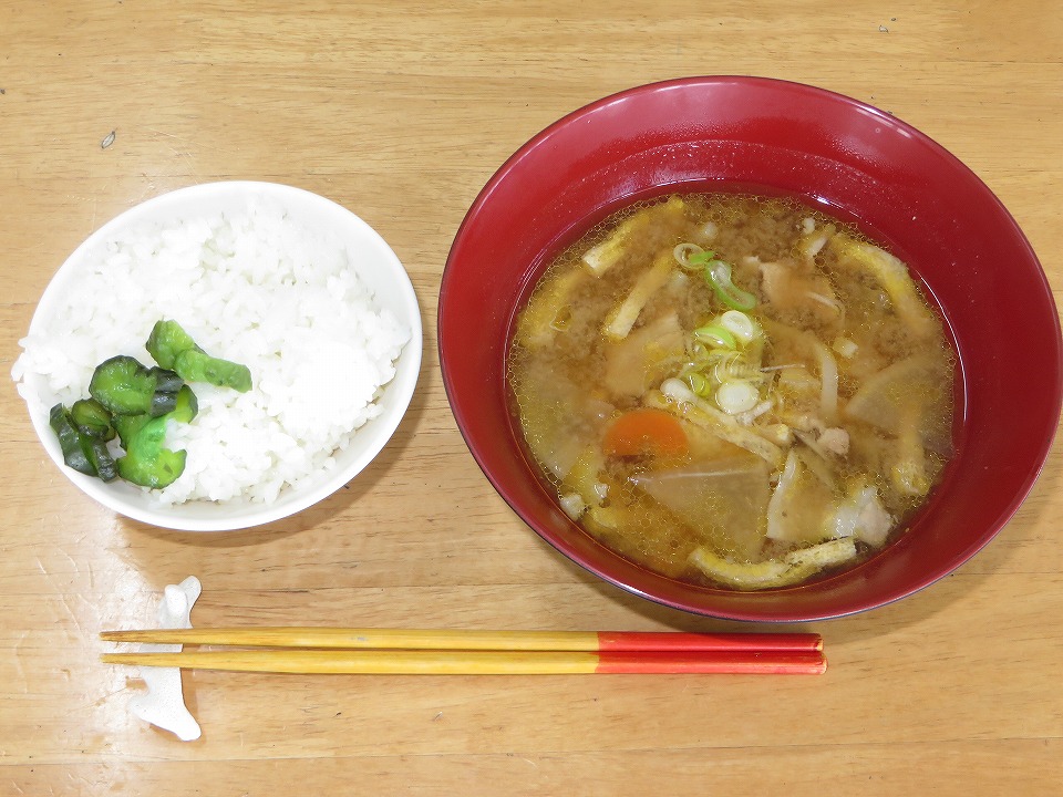 | 気分よく帰港して、昼メシ。 冷えた体に豚汁がしみるぅ。 |