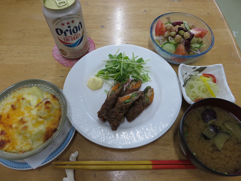 | 晩メシ。 この写真は、たまたまハウジングに入れていたコンデジで撮影した。 このとき気が付いたのだが、ストロボが点かなくなった。 今回のダイビングではストロボを焚くようなマクロ撮影はないので、これまで全然気付かなかった…。 |