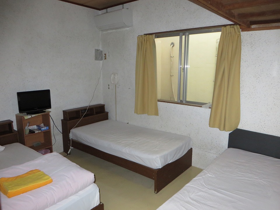 | 1泊素泊で3,500円ナリ。 ベッドが3つもあるゾ。 宿にはスタッフがおらず「外出中だからチェックインしたらTELしろ」 というメモが、フロント?に準備されていたキーに貼られていた。 そして電話しようとしたら、ちょうど他のチェックイン客がいて、俺もことも伝えてくれた。 ふがらっさー。 |