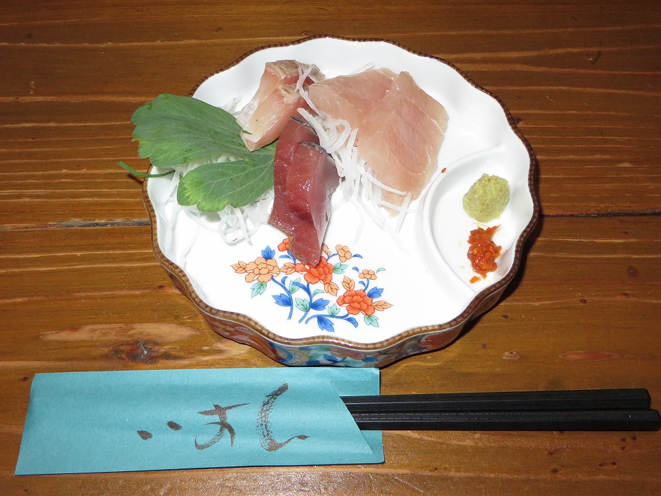 | 刺身の3点盛。献立にはなかったので値段はしらん。 写真の左から、はらご、カツオ、カジキ。 ちなみに、単品だとカジキもはらごも各700円。 もちろん単品なら、盛りは2切なんてことはないだろうが。 また、カツオの単品はなかったと思う。 はらごはまぁよかったが、あとは内地のスーパーでも買えるレベル。 YDSでたまに供される獲れたてのものとは比べるべくもない。 まあ、献立として常に準備しておく必要があるだろうから、獲れたてを望む方がムリってもんだ。 |