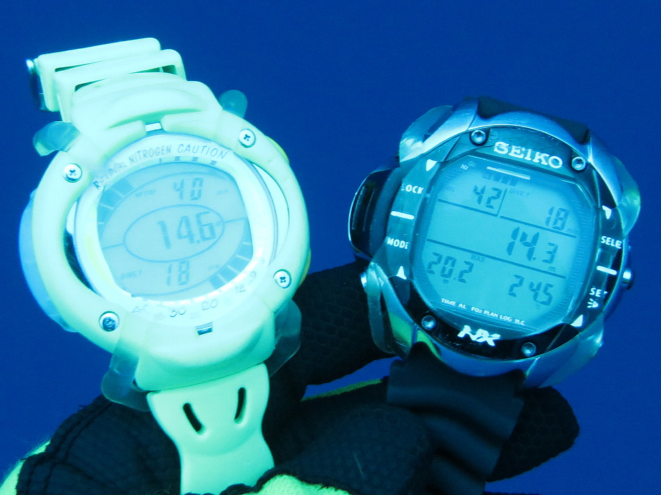 | あまりにもヒマだったので、出品予定のD.C.(左)と俺のメインのD.C.の表示の比較を撮影してみた。 左の物はジャンク品として1,985円でポチしたヤツを、俺が清掃&電池交換した。 今回の与那国島のダイビングで「じっけん君」として使ってみたら、ちゃんと機能した(嬉)。 別に儲ける必要はないので、100円で出品するつもり。いくらで落札されるかな。 |