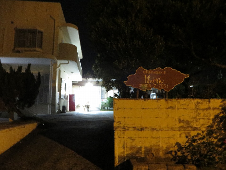 | さて、今回のダイビングが終わった。 今晩は、「よしまる荘」が取れなかったので、この1泊だけ久部良漁港近くの「はいどなん」にしてある。 というか、今日の宿である「はいどなん」が後からが確保できたので、ダイビングを1日延長した、という方が正しいんだけどね。 石垣~羽田の飛行機は元々26日(月)の便だから、当初は石垣で1泊する予定でいたが、 与那国島の宿にあちこち電話しまくってやっと確保できたのが、たまたま久部良の「はいどなん」だったので、俺にとっては都合がよかった。 荷物を持って歩いてラクラク宿替えできるもんね。 この写真は、YDSで呑んでヘロヘロくん状態になって帰ってきたときに撮影したもの。手持ち1秒なのでブレている。 |