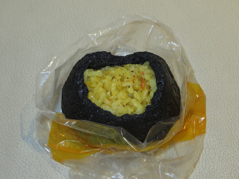 | 石垣に着いてハラごしらえをする。 「ブラックじゅーしー」401円ナリ。 カレーじゅーしーをイカスミを練り込んだかまぼこで包んだもの。 厚い海苔を巻いているのではないよ(笑)。 |