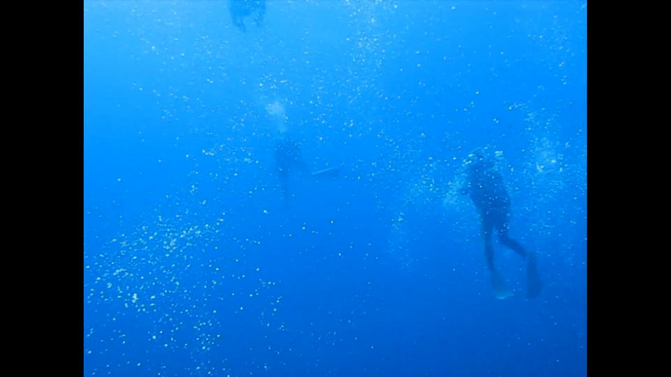 | いくつかの小規模なオオカマス玉を下に見つつ、 EXするちょっと前に巻潮になった。 ダイバーが吐くエアーが素直に水面に上がっていかない。 約20秒の動画はこちら。 |