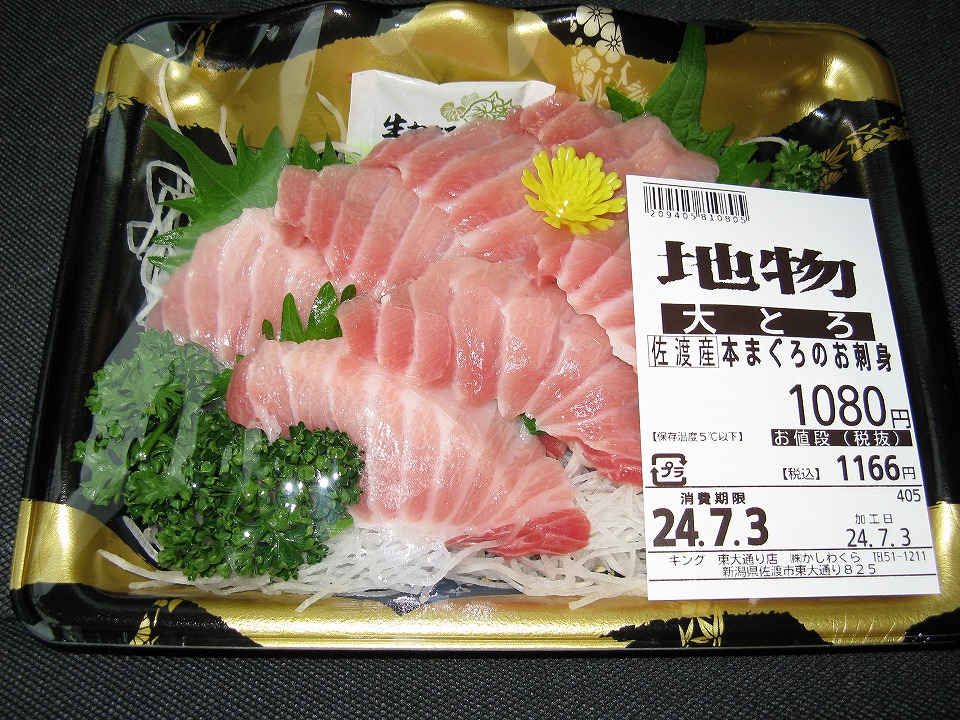 | 佐渡へ来たからには、地魚を堪能したい。 宿は素泊にしてあるから地元のスーパーに探検に行く。 なんと、佐渡産クロマグロの大トロの刺身があった。これは超ラッキー! 1パックしか残っておらず、お値段にちょっと躊躇したが、この機を逃すまい、とGETした。 特に夏前の時期に、佐渡沖でも少ないながらクロマグロが獲れる。 タイミングがいいと地元や新潟市周辺のスーパーに刺身が並ぶことがある。 今日は正にそのタイミングだったんだね。 ただ、このトシになると、だいぶヘヴィだった…。 |
