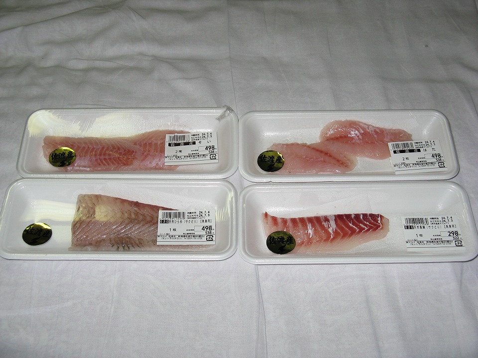 | 白身のラインナップ。 左上から時計回りに、ソイ・ハタ・ヒラメ・マダイ。 もちろん全て佐渡産。 どれも旨かったが、特にソイは絶品でしたね。 佐渡の酒がすすむくん。 |