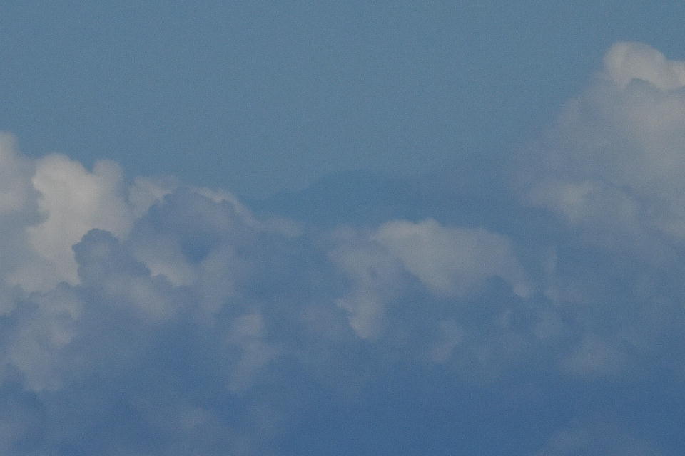 | 雨が降ってはいなかったが梅雨空の羽田を飛び立ち、 視界が少しよくなった頃に富士山が見えた。 田子の浦の上空から。 |