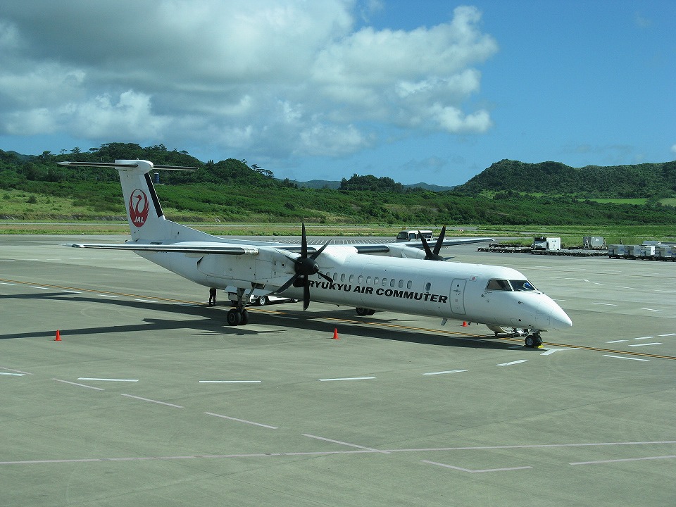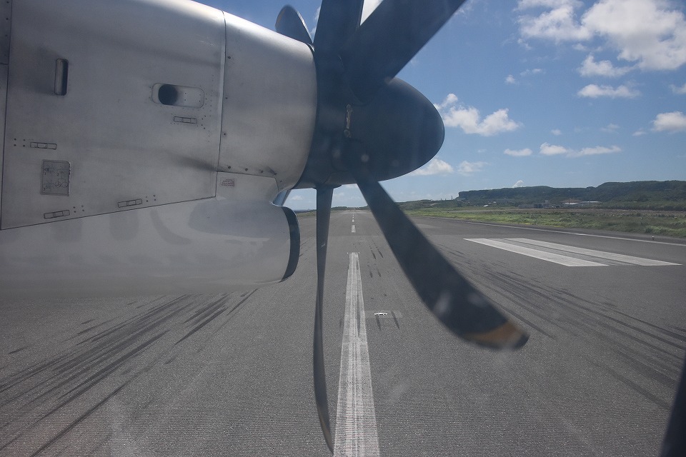 | 与那国島に着陸。 この写真はトリミングをしていない。 ね、思いっきりプロヘラが入るでしょ。 |