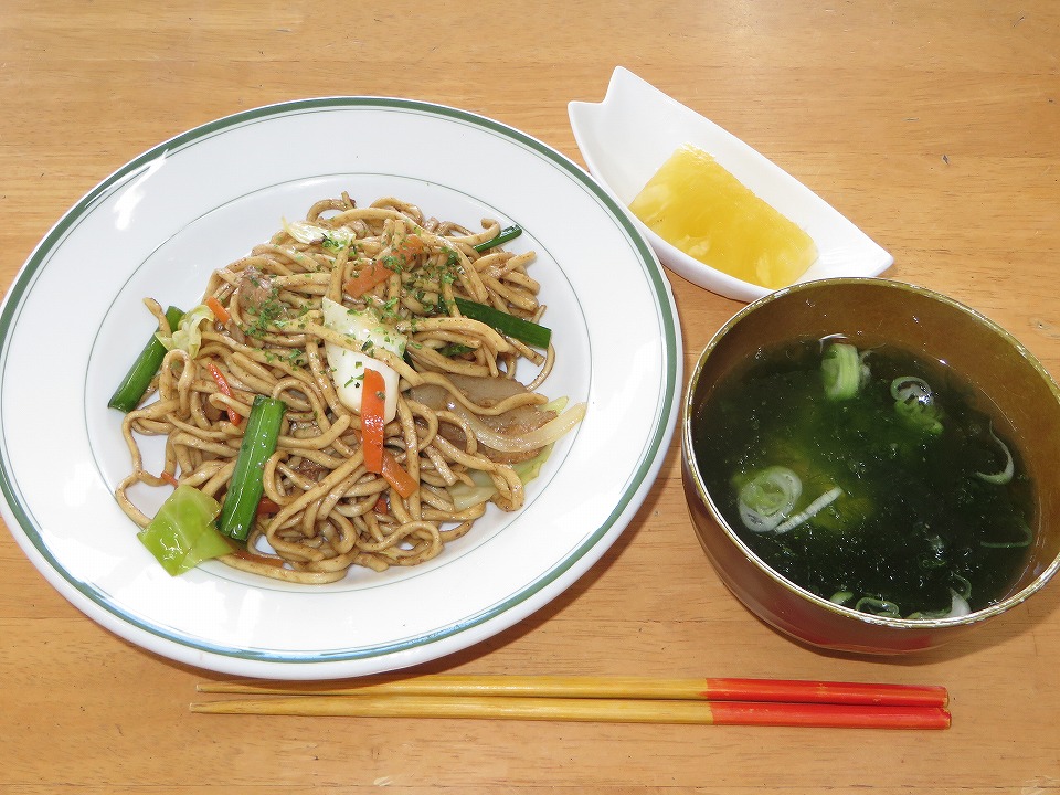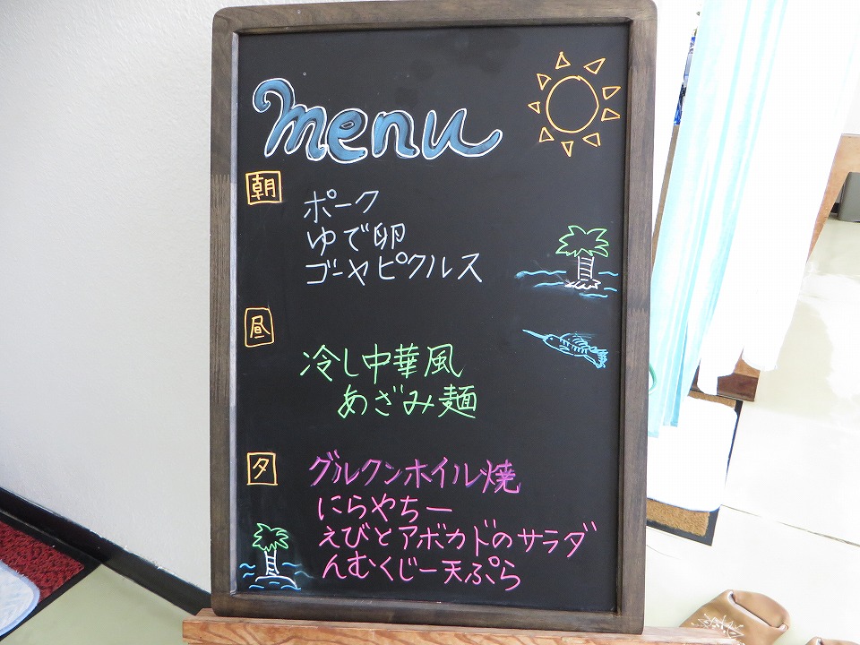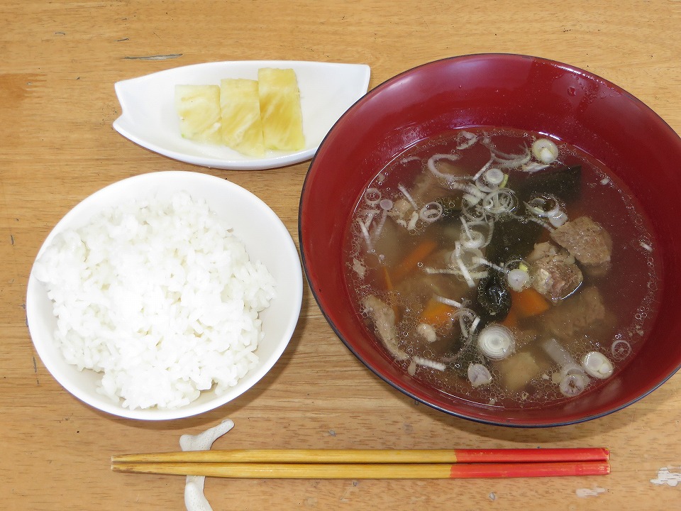 | いっただっきま~す。 麺はやいますば(八重山そば)なのだ。 パインの甘いこと甘いこと。 どれも、まーさんまーさん! |