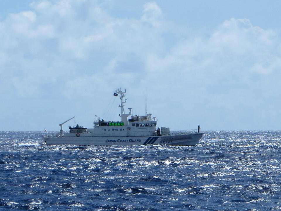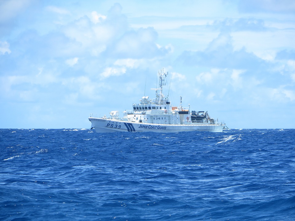 | さて、元気に2本目に行くぞッ。 沖合を海上保安庁の巡視船「まえやま」が通っていた。 この写真は揺れるボートからでも水平線がほぼ水平で撮影できたので、角度補正なしでノートリミングです。 |