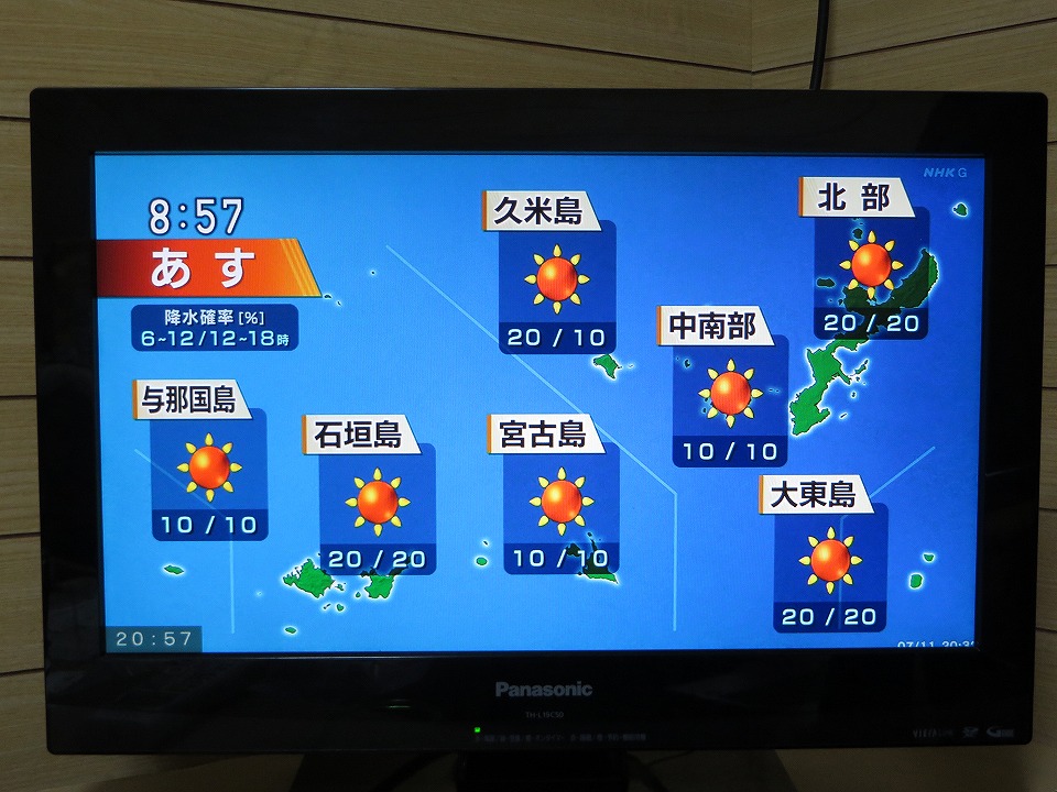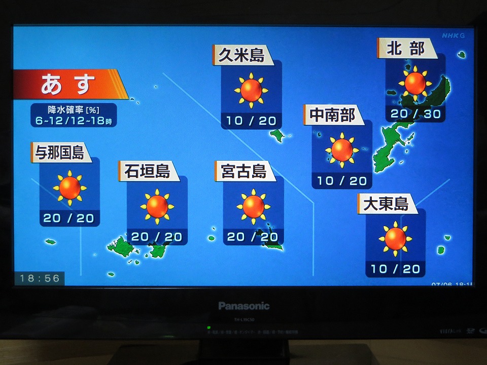 | 晩メシを食い終わってもまだ19時前なので、 19:42の日没までまだまだ時間がある。 明日の天気も晴れ晴れ晴れ晴れ晴れ晴れ晴れ!(マークの数と同じ7つ。) |