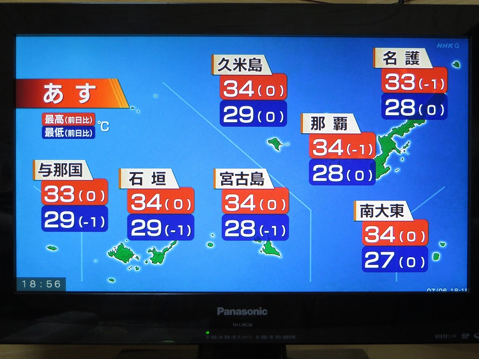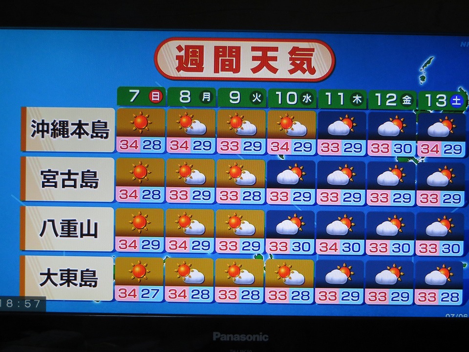 | この先もしばらくずっと晴れ。 梅雨明けしてもう2週間近いのに台風が来ない。 まぁ、ダイバーにとっては嬉しいけど、水温が高くなるので珊瑚の白化が心配だ。 |