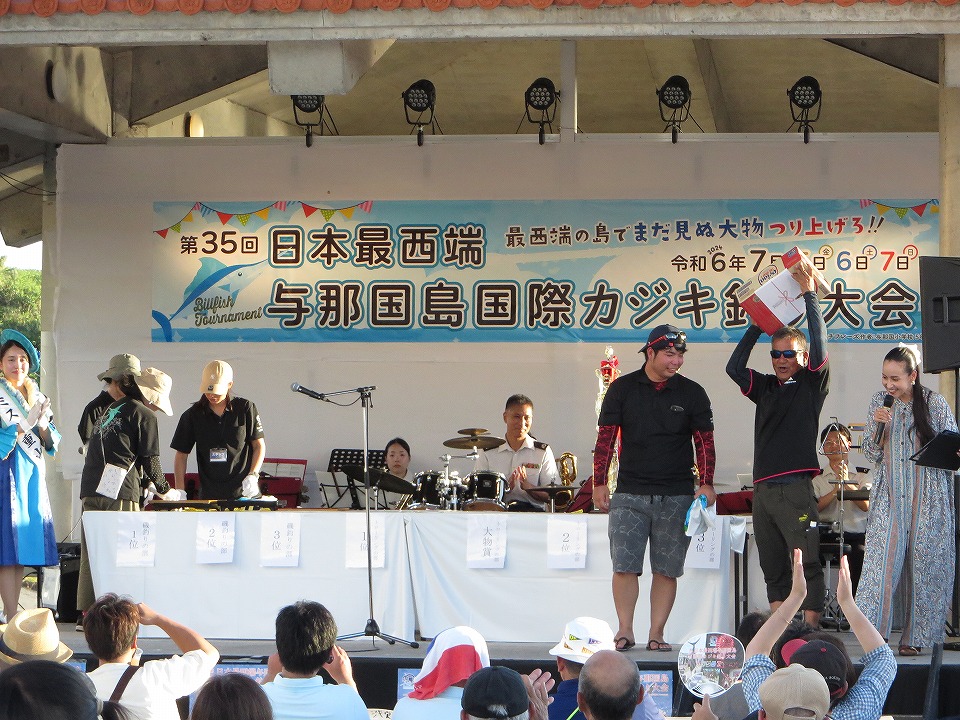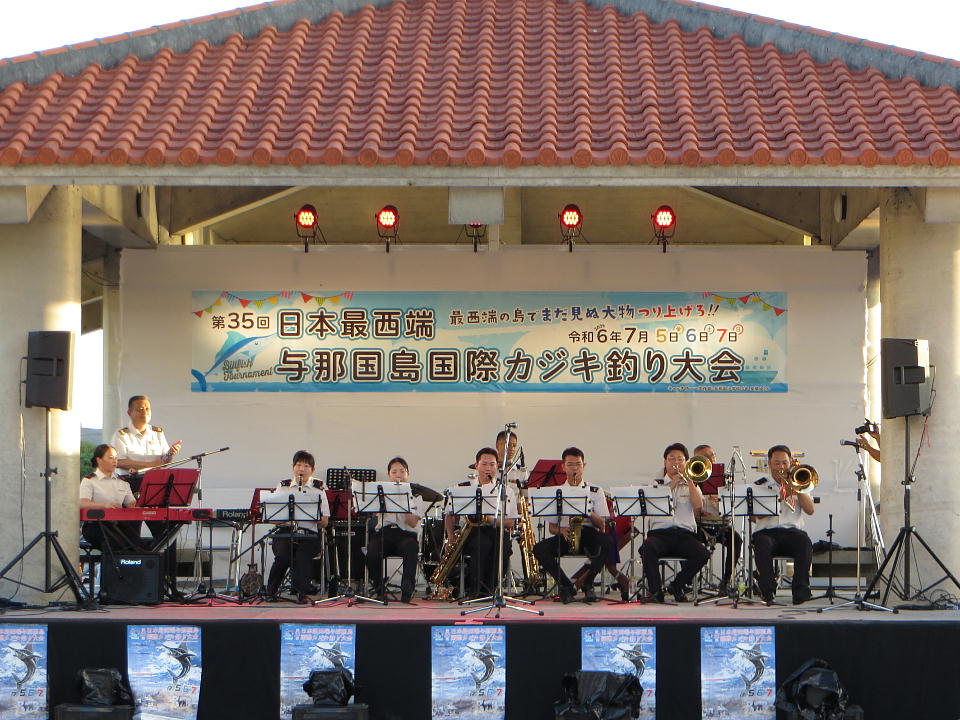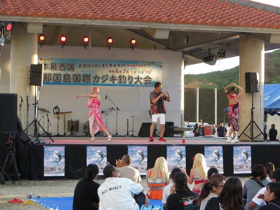 | やっと日没が近くなり、暑さが和らいできたので、外に出てカジキ釣り大会の会場をちょっと冷やかす。 ステージでは、大阪のお笑いバンド?のライブをやっていた。 ちなみに、観客の最前列の金髪の2人は、おね~さんじゃなくてオッサン(笑)。 |