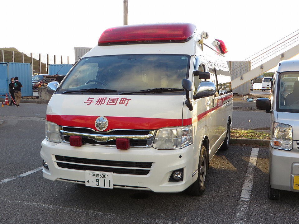 | 非常時に備えて救急車もスタンバっていた。 ただこのクルマ、無線を載せていないようだったので違和感を憶えた。 小さな島ならケータイでの連絡で足りるのか。 あ~あ、俺は無線関係の仕事をしているので、職業病だね…。 忘れろ忘れろ。今は与那国島に来てるんだゾ。 |