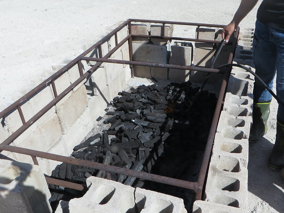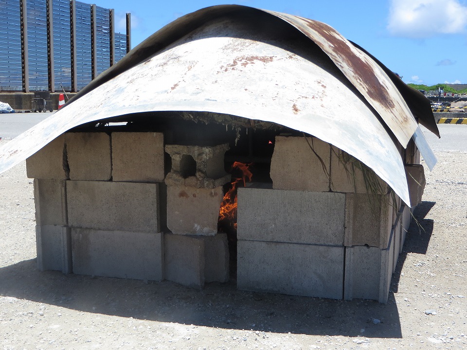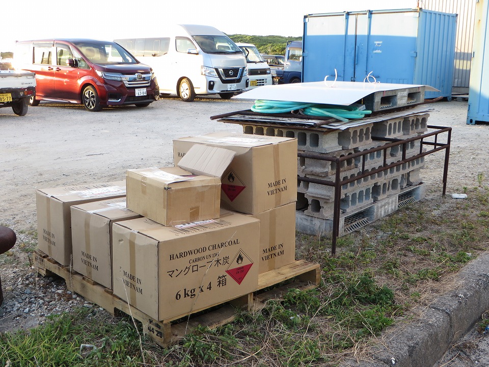 | さて、1本目に出かける。 港ではカジキの火葬もとい丸焼きの準備をしていた。 炭で火起こししてる。 |