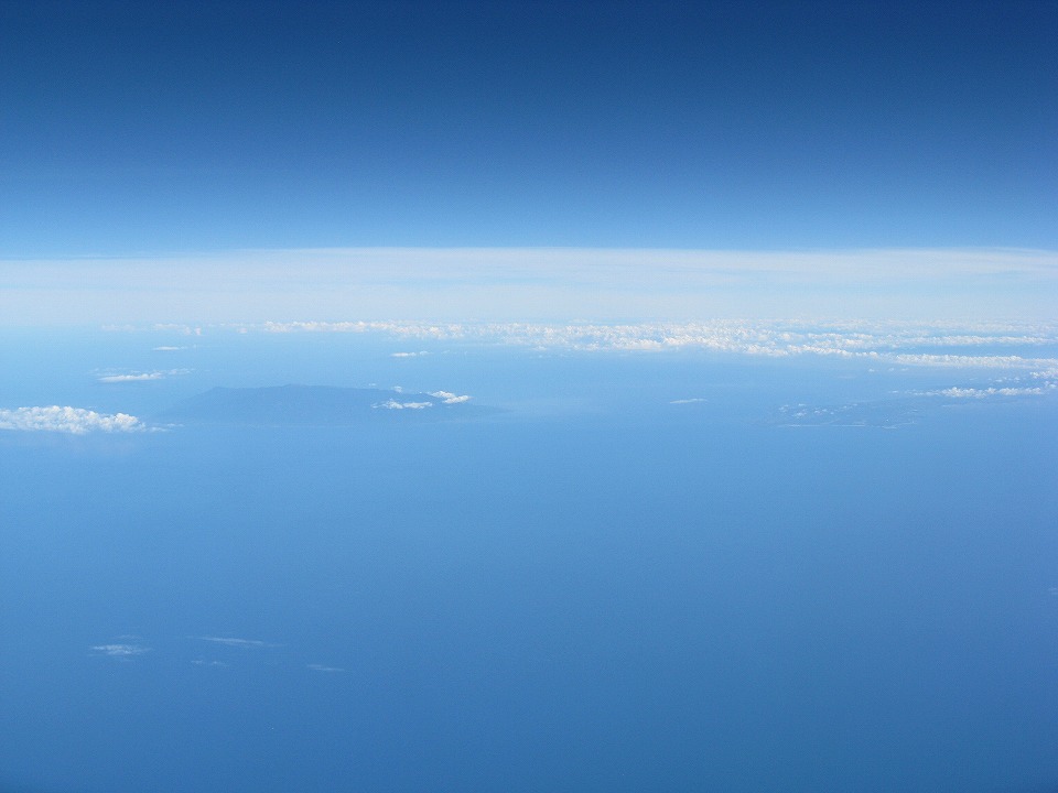 | 左が屋久島、右が種子島。 「1か月で35日雨が降る」と言われるほど雨が多い屋久島だが、 このときは屋久島の上空にはほとんど雲がかかっていなかった。 昔、YS11のプロペラ機で縄文杉を見に行ったっけ。 これまで何十回と沖縄便(しかも基本的に進行右の席)に乗っているが、 この2島を見たのは今回が初めてだ。 |