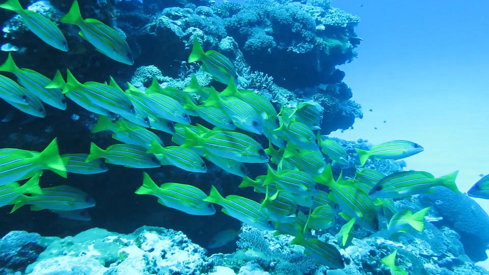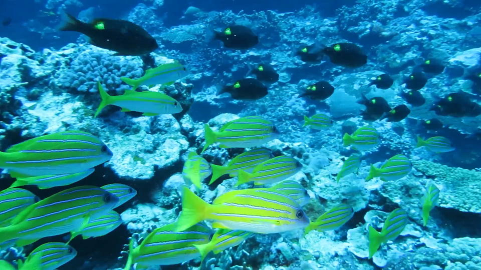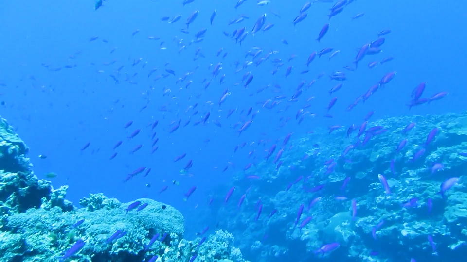 | ヨスジフエダイが群れる。 約15秒の動画はこちら。 |