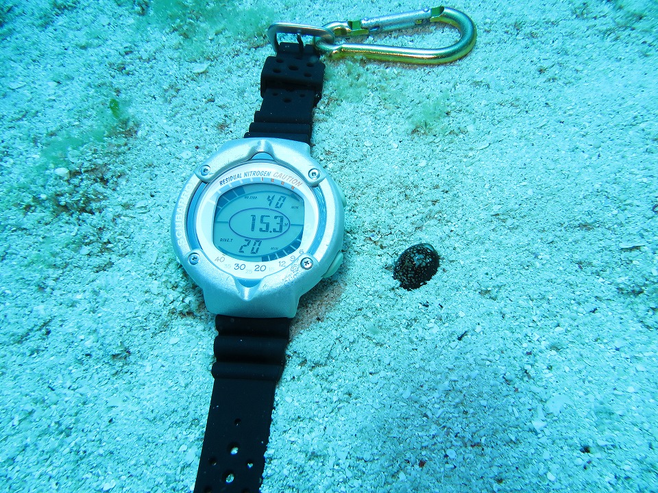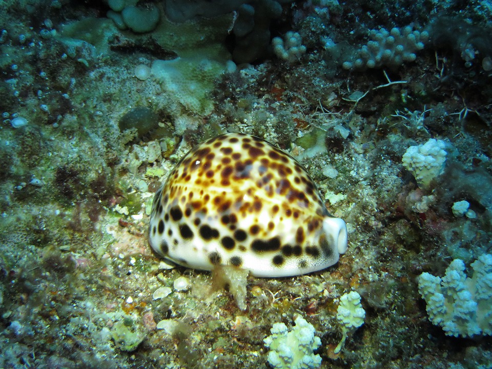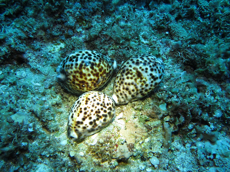 | 近くの港でちょっと休憩して、2本目を地形ポイントで潜る。 クチムラサキダカラのよさげなのが転がっていたのでGETしたが、 表面のエナメル層は剥がれていたのでBランク…。 |