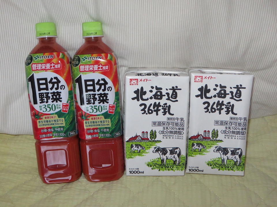 | 今回も、野菜類とカルシウムの補給として、 野菜ジュースと常温保存可能な牛乳を、 前もって信州から送ってあった。 |