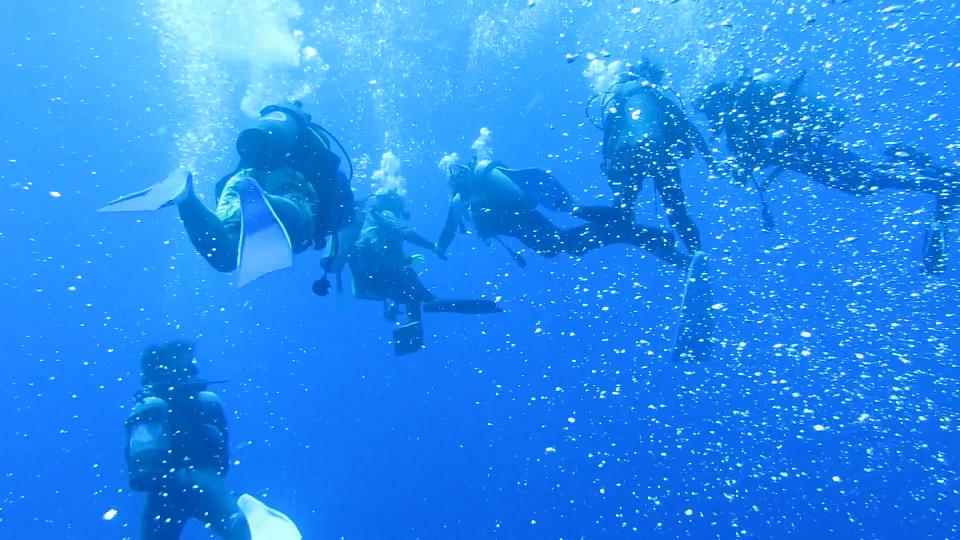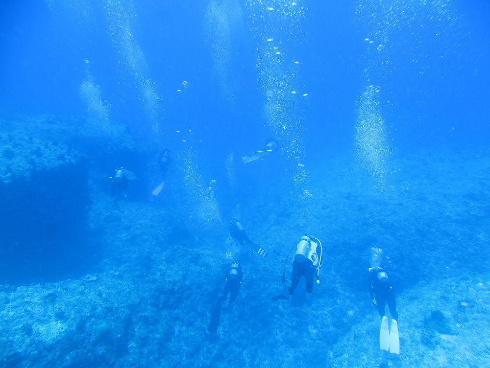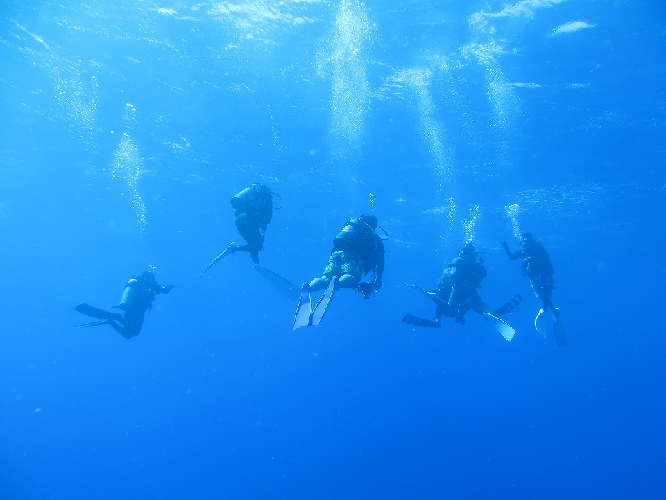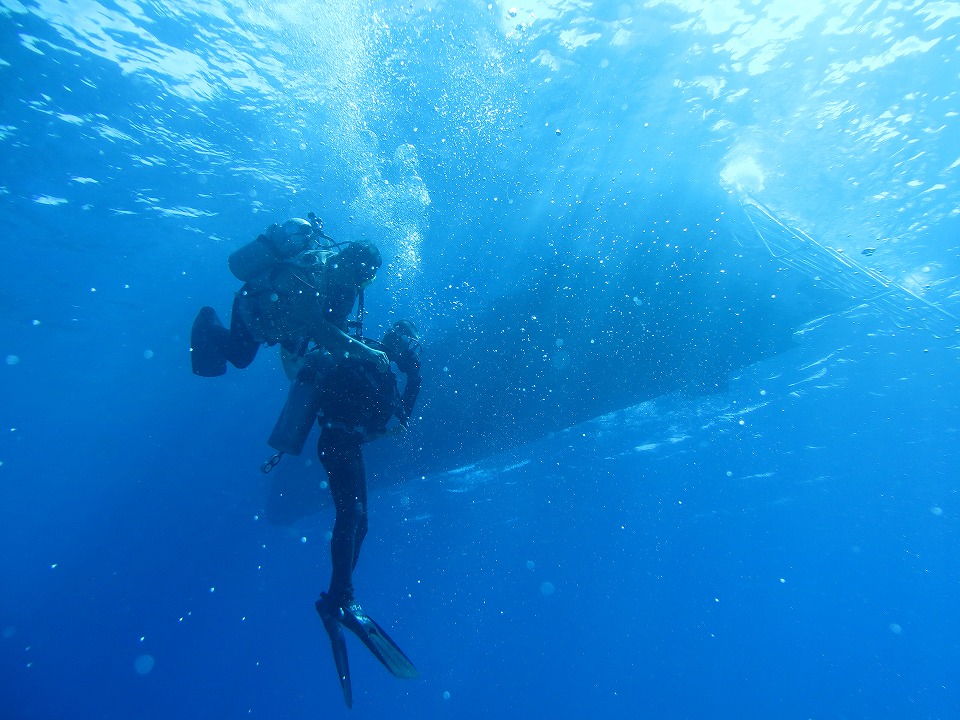 | 1本目スタート。 耳抜きなどが苦手なダイバーは、スタッフが潜行をアシストしてくれる。 心強いね。 |