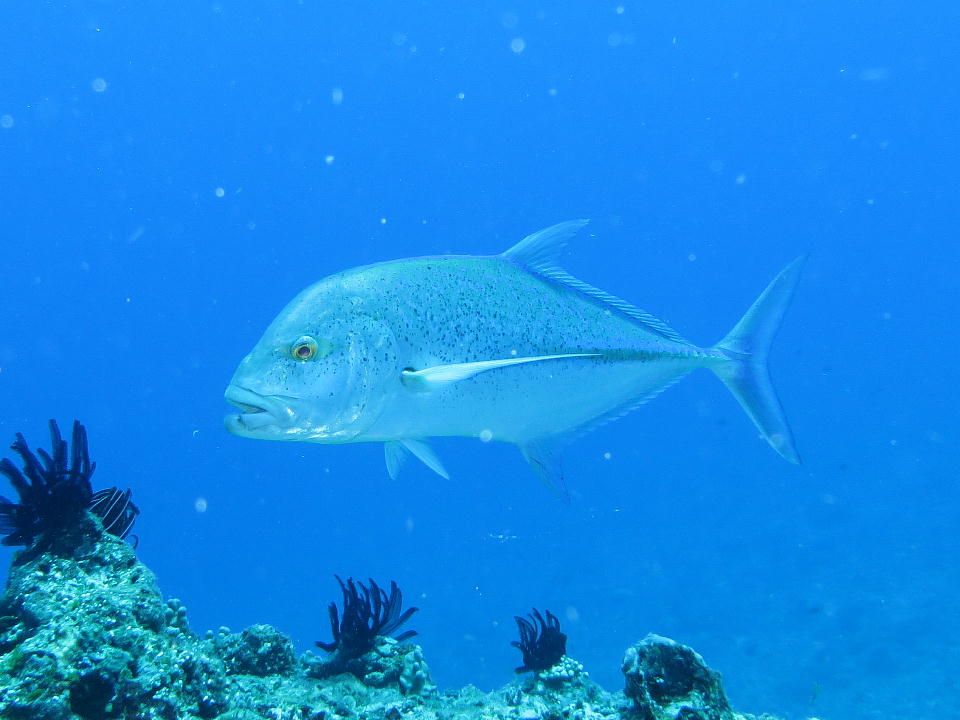 | ダイバーに興味を持ってやって来たのか、 ダイバーの周りをうろついていたカスミアジ。 |