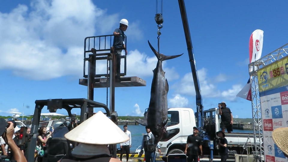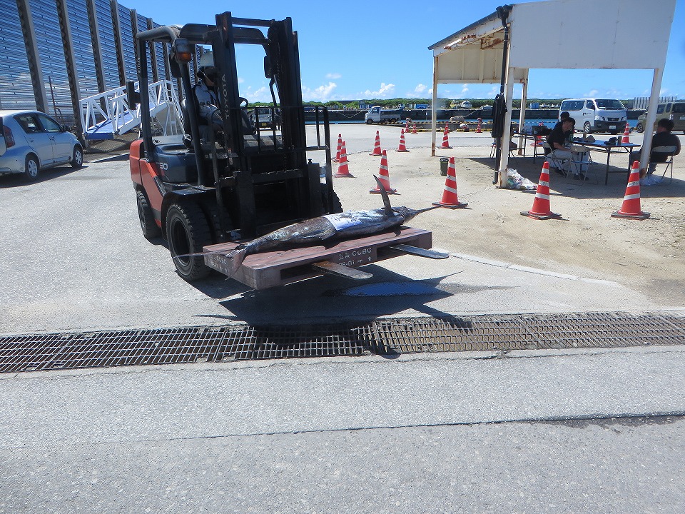 | 帰港したら、ちょうど今日2匹目のカジキが揚がった。 ヒトがフォークリフトに乗って秤を読む。 約15秒の動画はこちら。 音がほとんどしないのはカメラをハウジングに入れたままにしてあるからだよ。 |