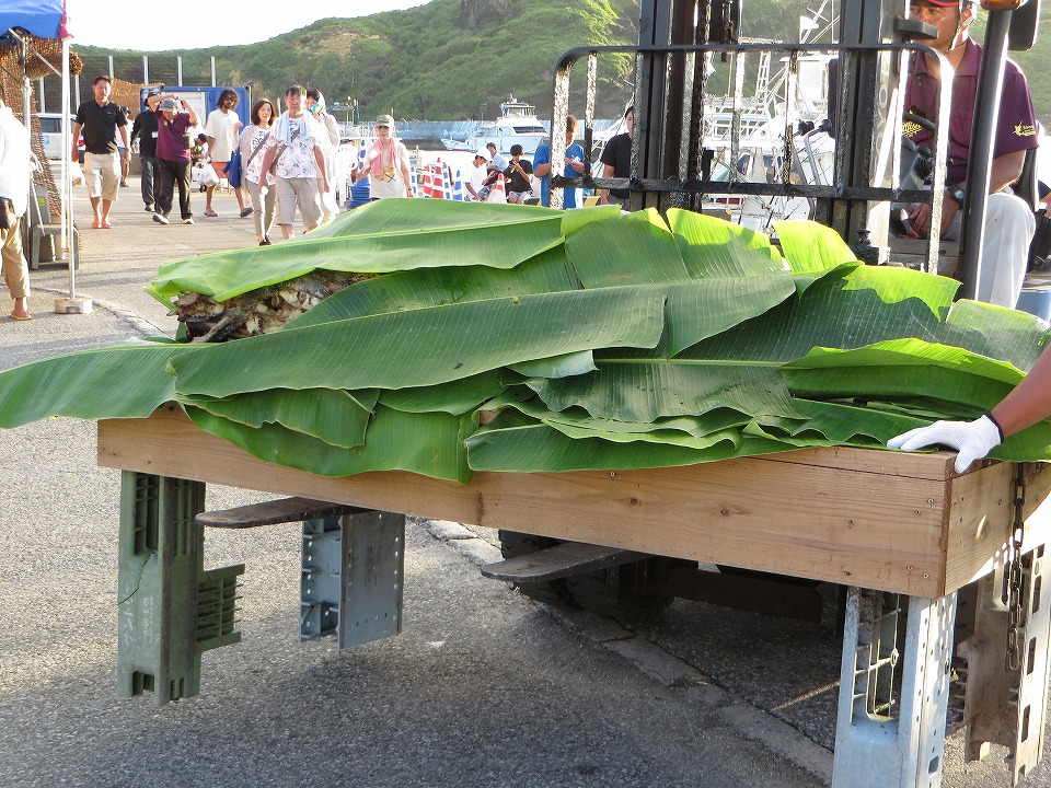 | そしてお待ちかねのカジキの丸焼きのできあがり。 フォークリフトで持ってくるのはいつもおんなじ。 今年のは280kgあるそうで、去年(令和05年)の140kgの、ほぼ倍の重さだ。 |