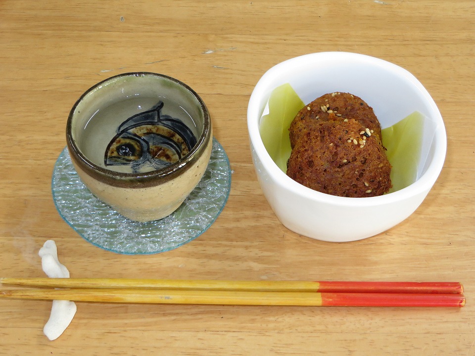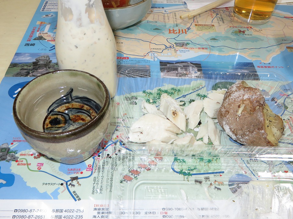 | メシが一通り終わったら、んむくじー天をつまみに「どなん」を呑む。 んむ(いも)くじ(くず)と呼ばれるが、でーじまーさんよー。 |