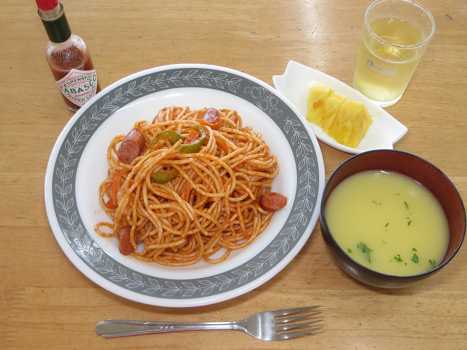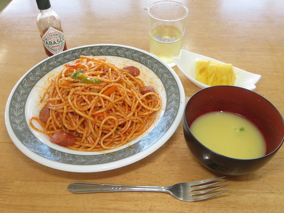 | の~~~んびり楽しんで戻ってきたら、昼メシだよ~。 俺の大好物のナポリタンだったので大盛で頼んだ。 タバスコをこれでもかと振りかける。 何度も書くが、俺はギッチョだから、フォークの置き方はこう。 お椀でいただくコーンポタージュスープってのもオツでしょ。 |