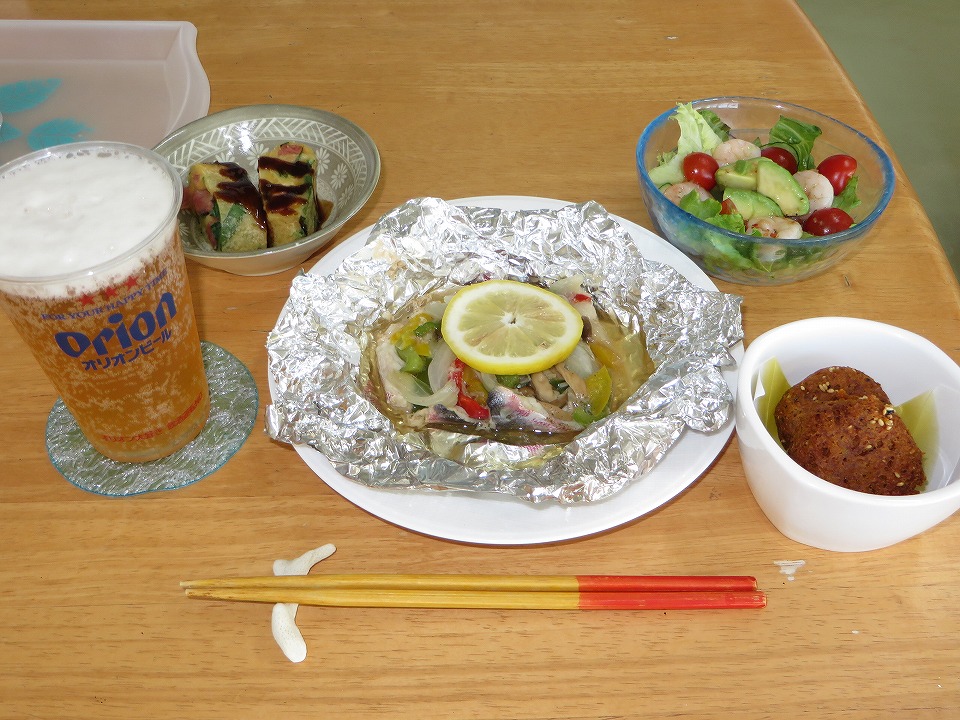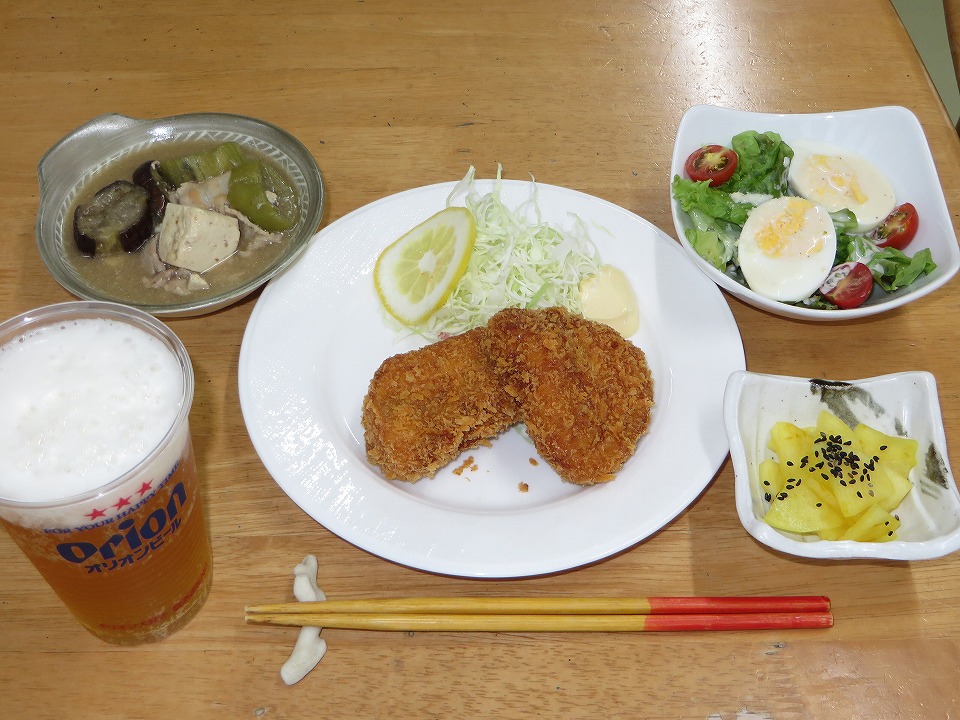 | やっと晩メシ。 今晩はカジキフライだ。 カジキ釣り大会が終わったので、いつもの食堂で摂る方式に戻った。 オリオン缶を3本も呑んじまった。 |