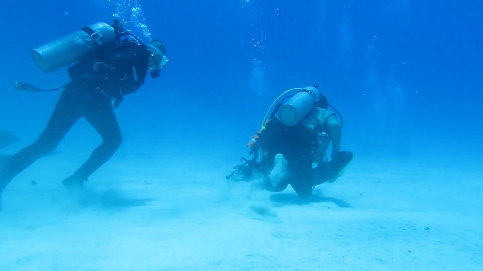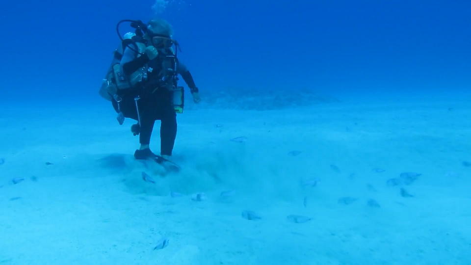 | 砂地で遊ぶ。 ここ限定だが、砂を巻き上げてもほとんど濁ることがないので、 どんどん巻き上げてみる。 かけっこの様子の約20秒の動画はこちら。 |