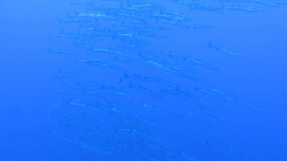 | 西崎では、オオカマス玉(バラクーダ玉)が見られた。 ちょっと遠かったな~。 約10秒の動画はこちら。 |
