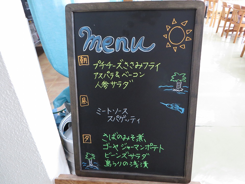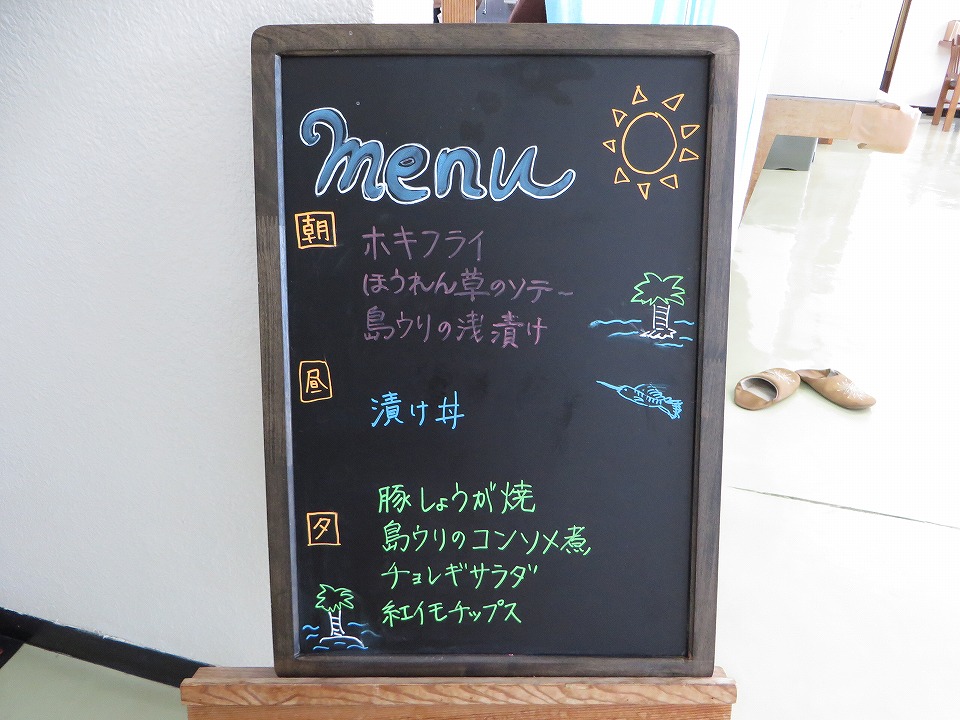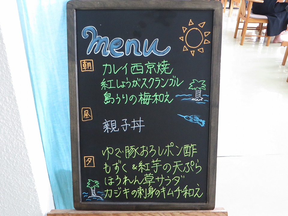 | 朝メシ。コメはお代わりしてしもた。 箸置きは、昨日ナーマ浜で拾ってきて、今朝厳選したもの(笑)。 |
