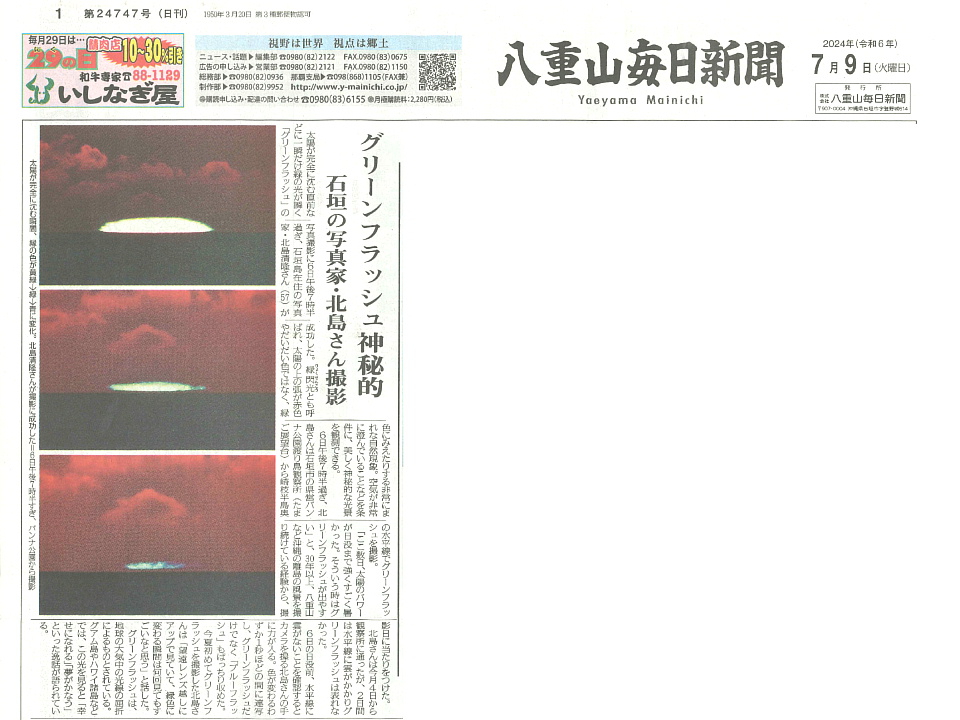 | 参考だけど、9日の八重山毎日新聞に、 石垣島で撮影された「グリーンフラッシュ」の写真が載っていた。 俺も撮影してみたいなぁ~。 |