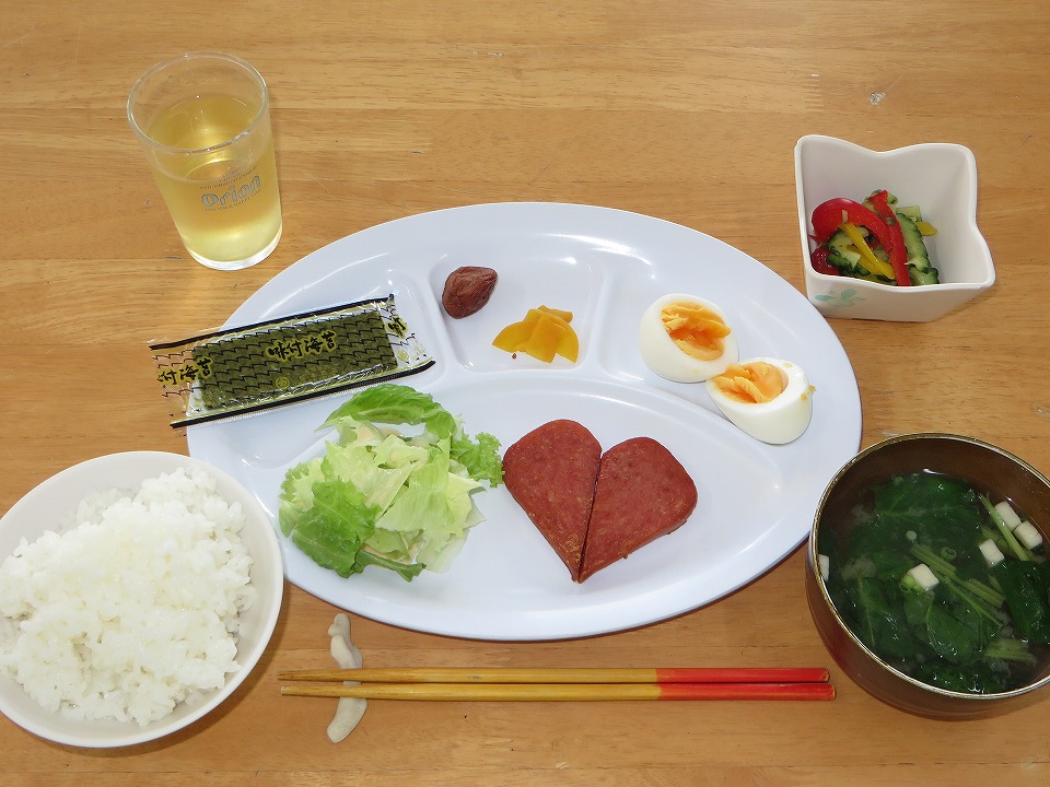 | 朝メシ。 ポークがハート型に置いてあるのがいいね。 |